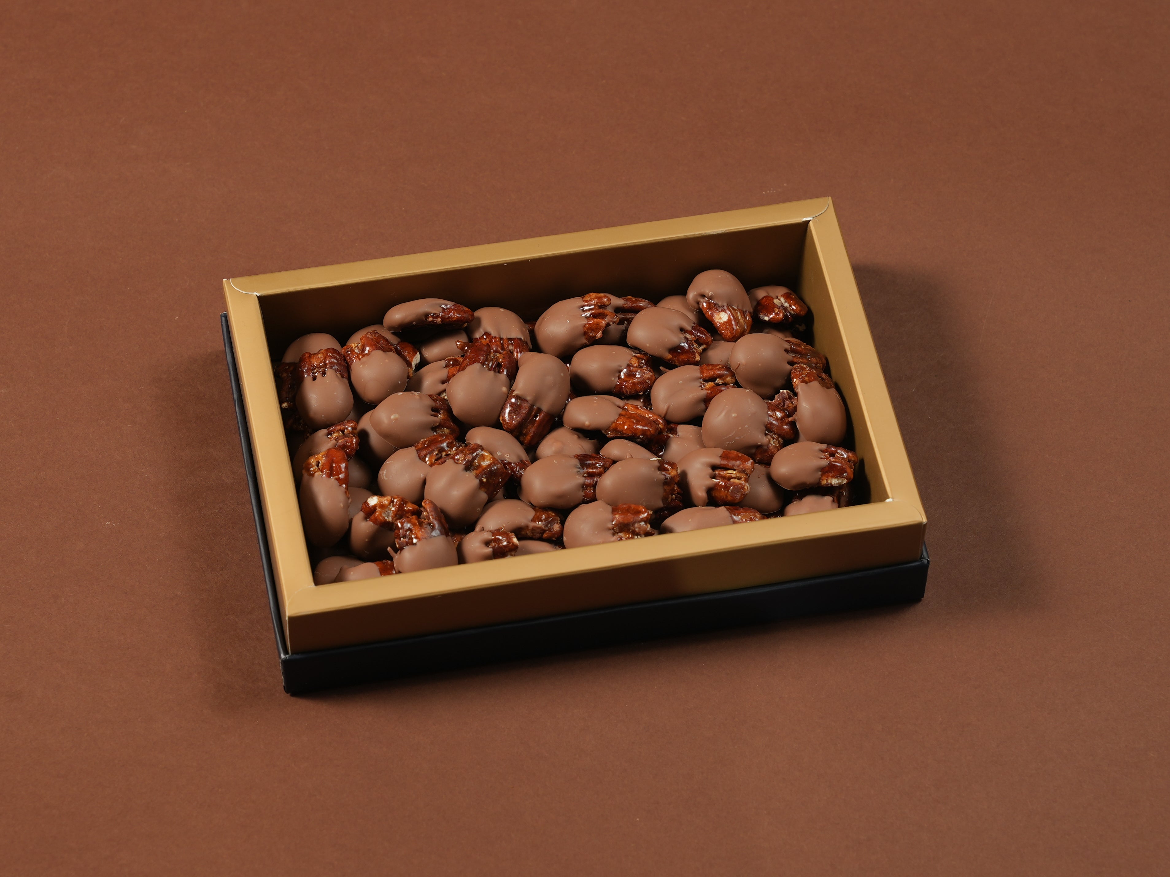 Experience the perfect blend of taste and texture with our artisan caramelized pecans, expertly crafted for a truly indulgent treat. Each premium pecan is carefully caramelized to create a crisp, golden coating, then generously enrobed in a smooth, rich layer of gourmet chocolate. The result is a delightful harmony of buttery, nutty flavor balanced by the sweetness of caramel and chocolate.