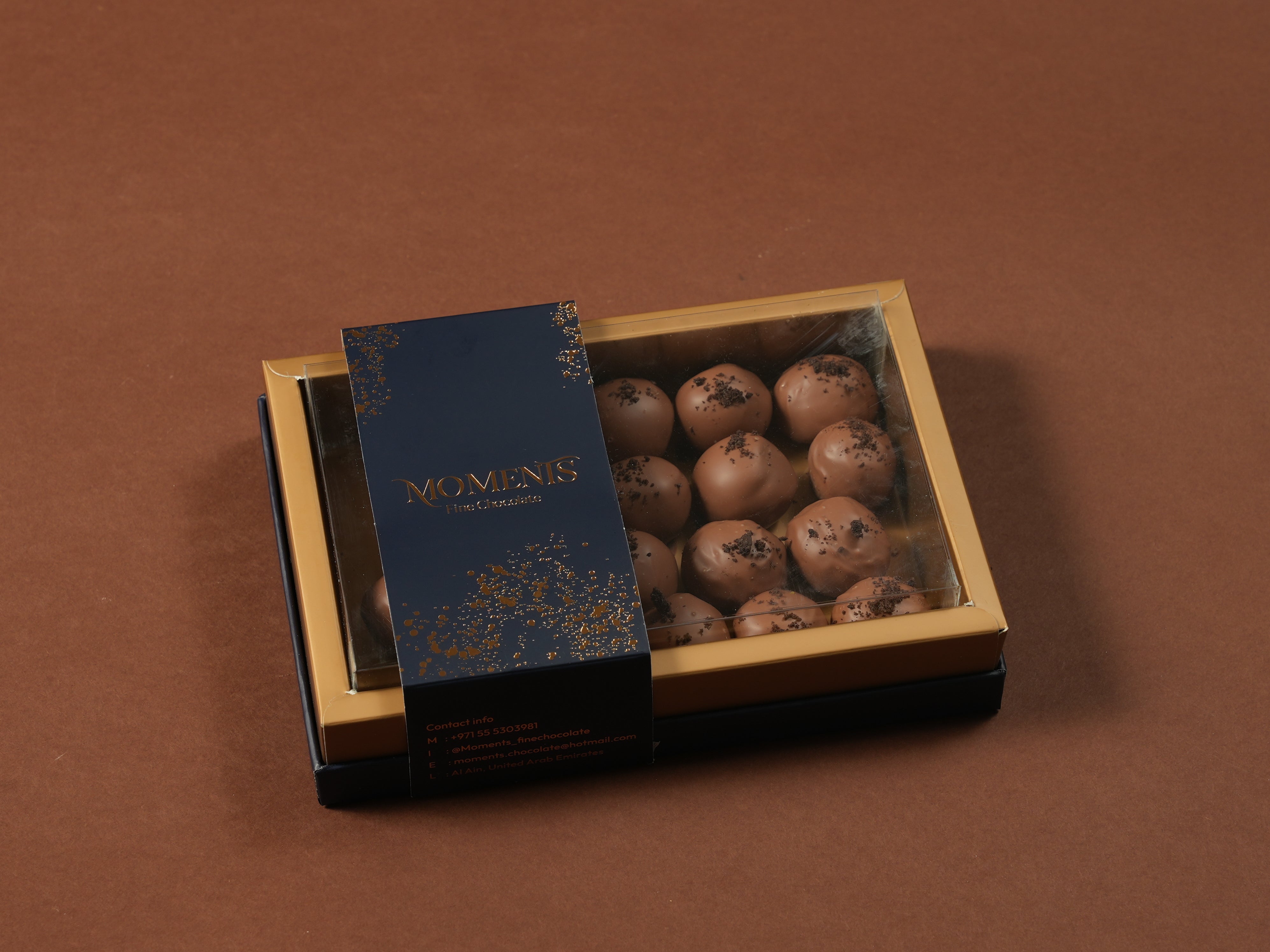 All product content—including images, logos, and branding—belongs to Moments Fine Chocolate and may not be reproduced without permission. Promotions and discount codes cannot be combined unless stated otherwise and may be revoked if misused. We are not liable for any indirect or consequential damages related to the use of our site or products. These terms are governed by UAE law. Our products may contain or come into contact with allergens like nuts, dairy, soy, and gluten; we advise customers with allergies to contact us before ordering. For support, reach us via WhatsApp at +971 55 530 3981 or email moments.chocolate@hotmail.com