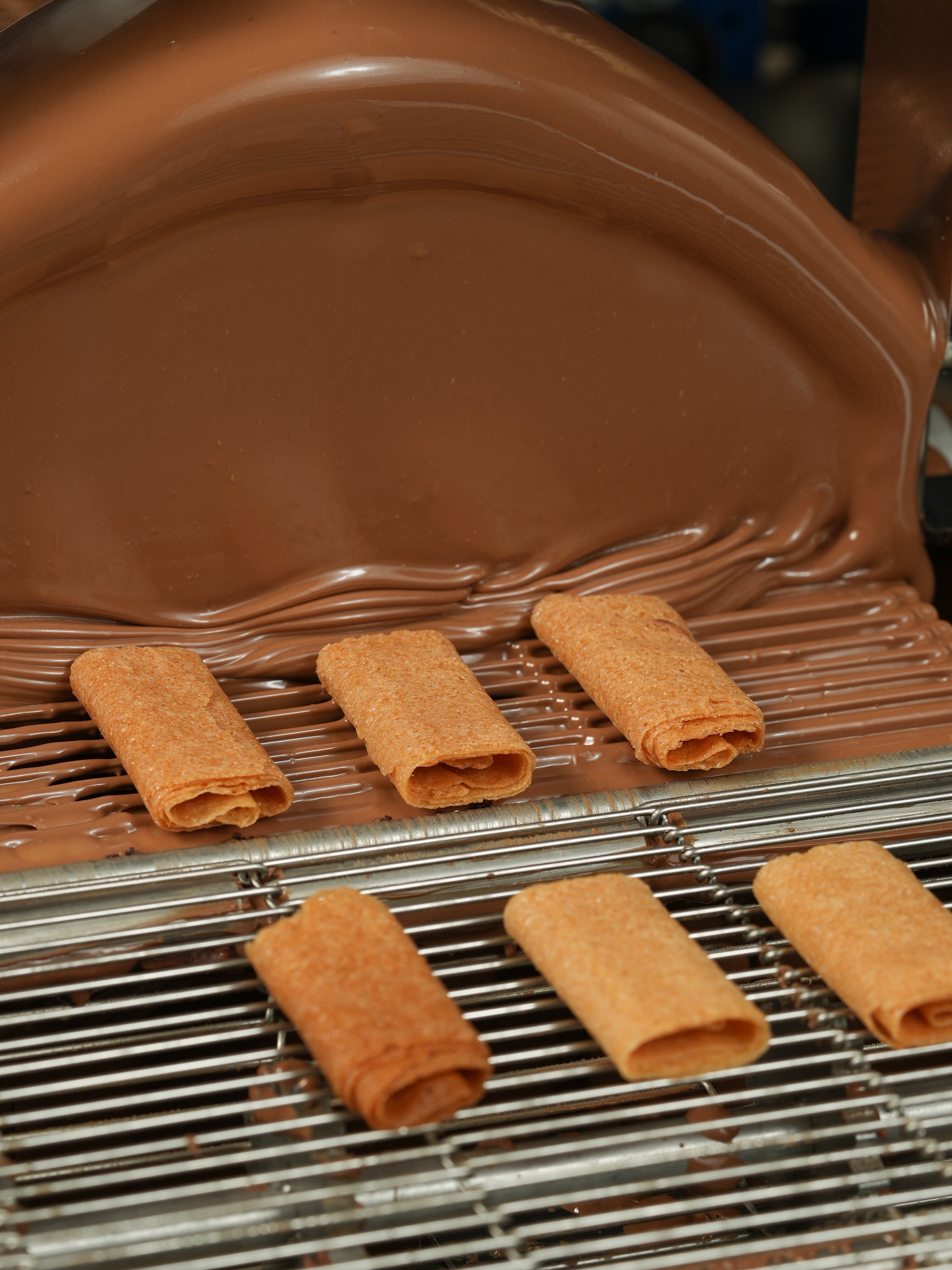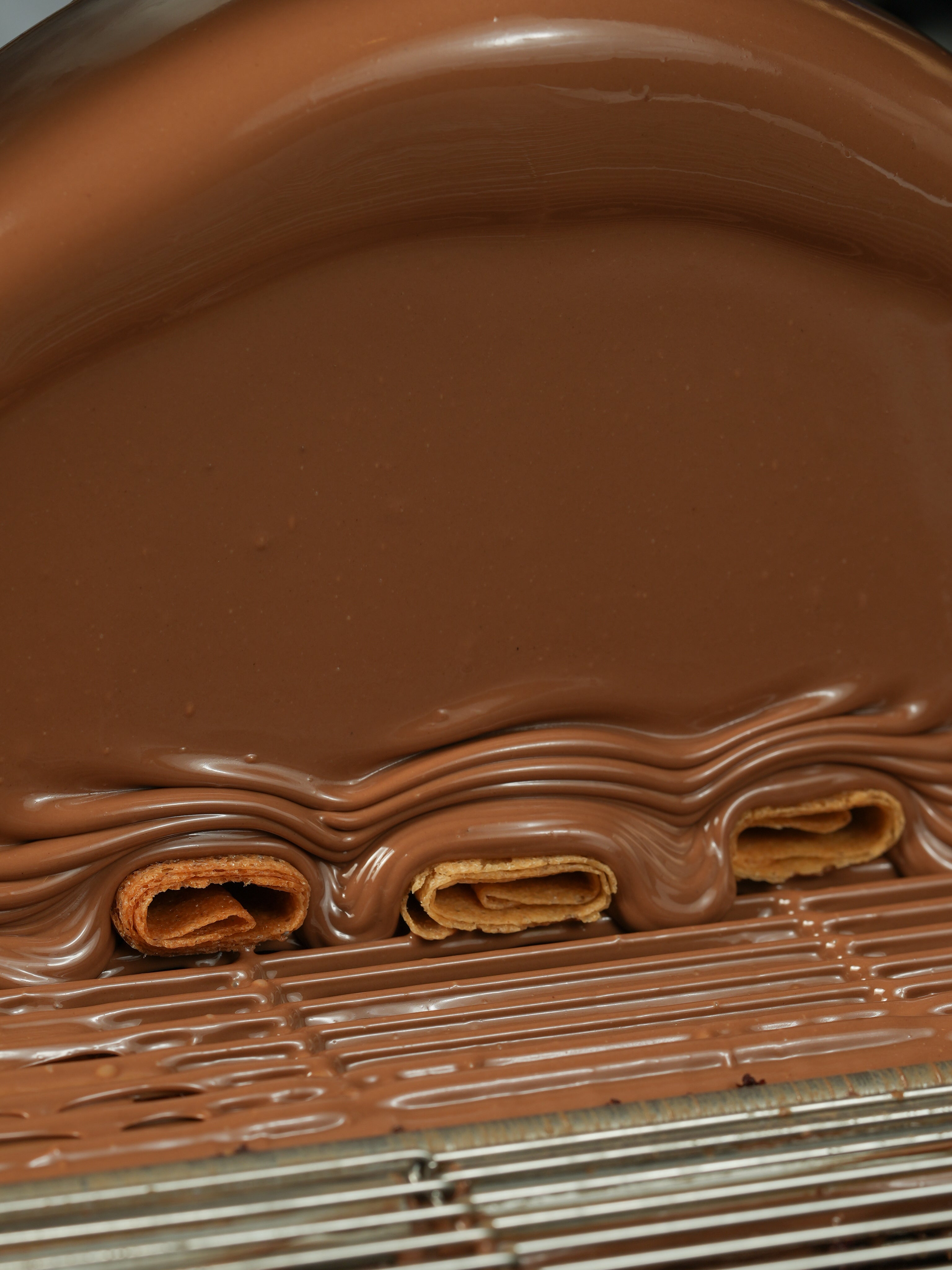 Experience the ultimate indulgence with our premium crispy crepe treats, expertly crafted for both visual appeal and exquisite taste. Each delicately layered crepe is enrobed in a rich, velvety milk chocolate coating, offering a glossy, eye-catching finish that enhances its elegant presentation.