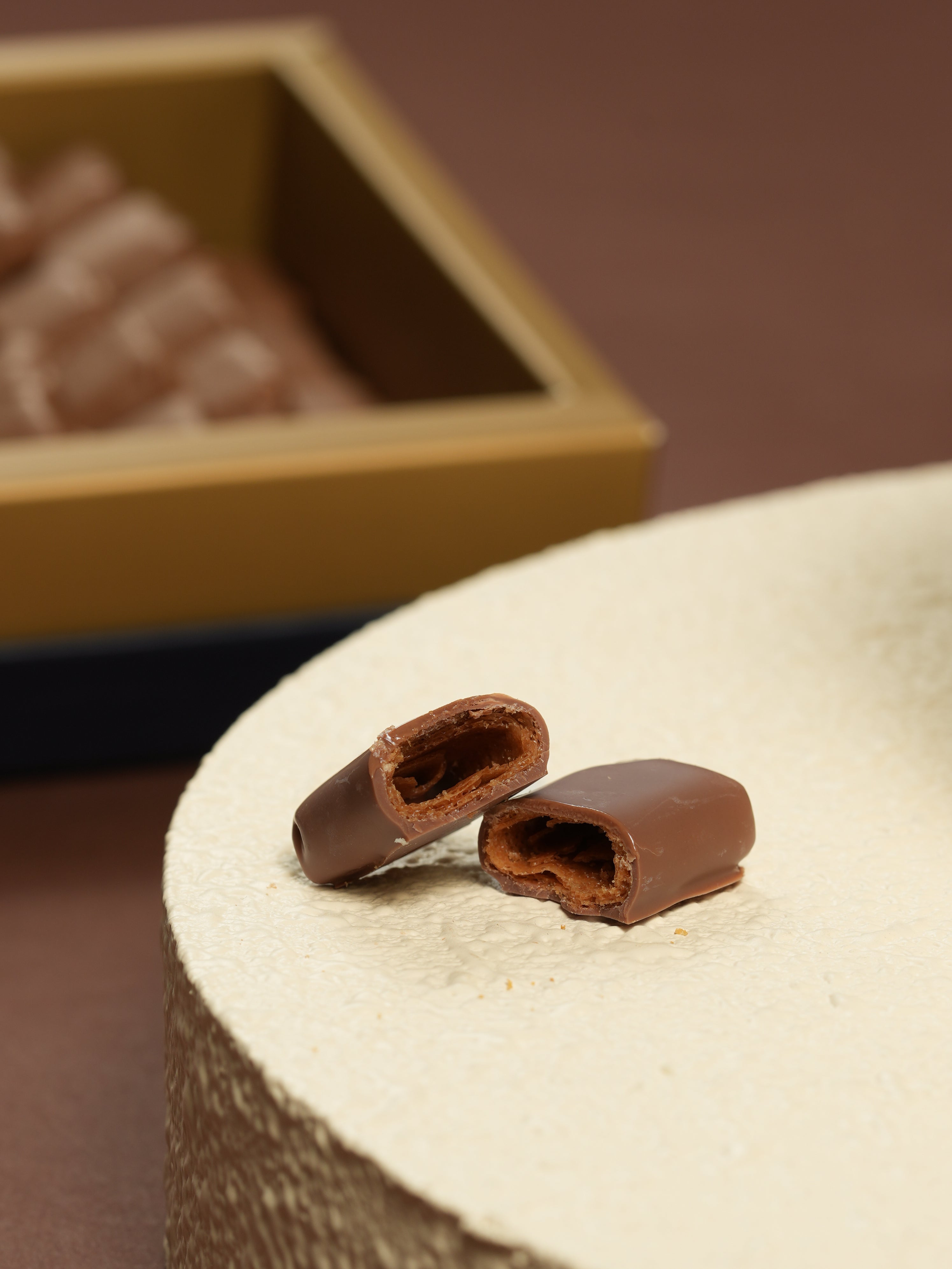 When sliced, the light and airy interior reveals the signature crunch of finely baked crepe layers, creating a satisfying texture that perfectly complements the smooth sweetness of the chocolate. These gourmet snacks offer a harmonious contrast of flavors and textures, making them an irresistible choice for chocolate enthusiasts and refined palates alike.